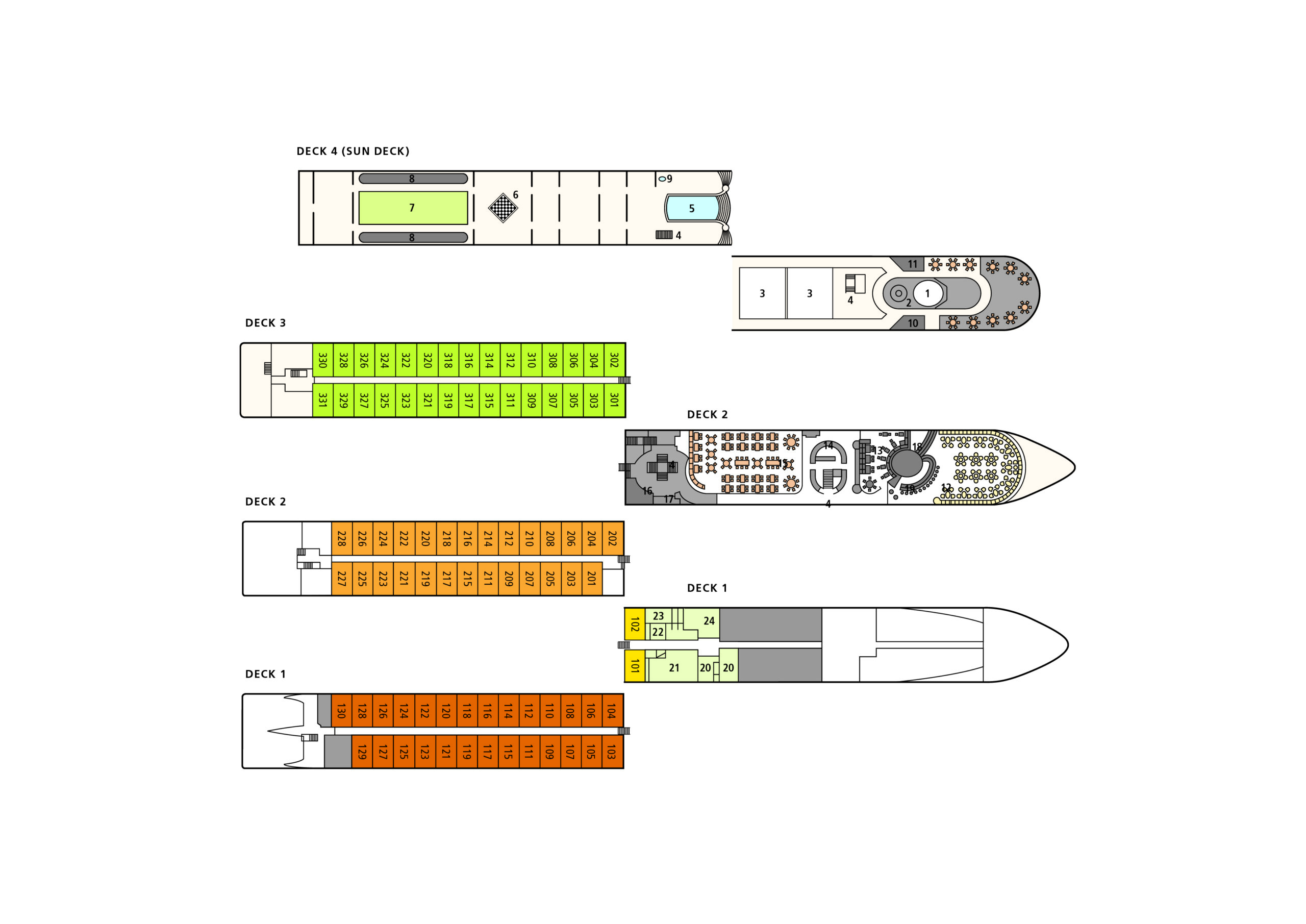 De 2 søsterskibe AROSA Luna og AROSA Stella sejler for Arosa Cruises på Rhone og tilbyder ialt 86 udvendige kahytter. På dæk 3 findes der 30 D kahytter (FINO Premium) som inviterer med 15 m² størrelse og Juliette Balkon til at nyde den smukke udsigt. På dæk 2 findes der 27 C kahytter (FINO populær) med Juliette Balkon. På dæk 1 findes der 29 af de udvendige A kahytter (FINO Standard). De har vinduer, der ikke kan åbnes. Alle kahytter er flot udstyret med pengeskab, aircondition, tv, hårtørrer, badeværelse med bruser og toilet, saunahåndklæde, uldtæppe, telefon, badekåbe.