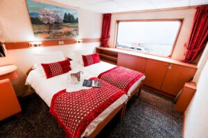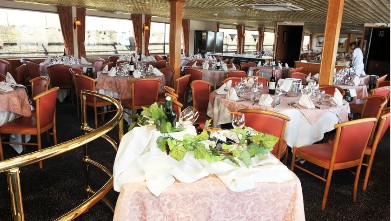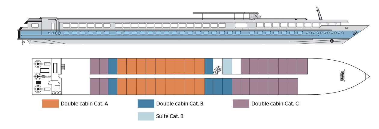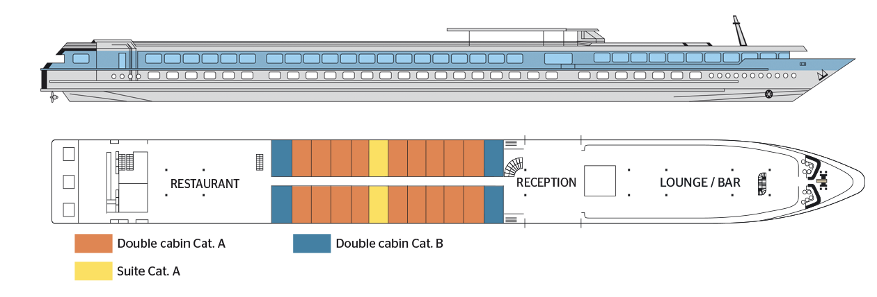 fordelt på to dæk. Hver af dem, komfortable og rummelige, tilbyder faciliteter og giver gæsterne al den komfort, de har brug for under deres ophold. Dekorationens varme orange toner samt det gyldne træværk skaber en varm og indbydende atmosfære. Beliggende på det øverste dæk tilbyder restauranten et delikat køkken i raffinerede omgivelser, hvor store karnapper giver gæsterne mulighed for fuldt ud at nyde panoramaet. Loungebaren med dansegulv er placeret på samme dæk, mens soldækket er et ideelt sted at slappe af og beundre landskaberne.