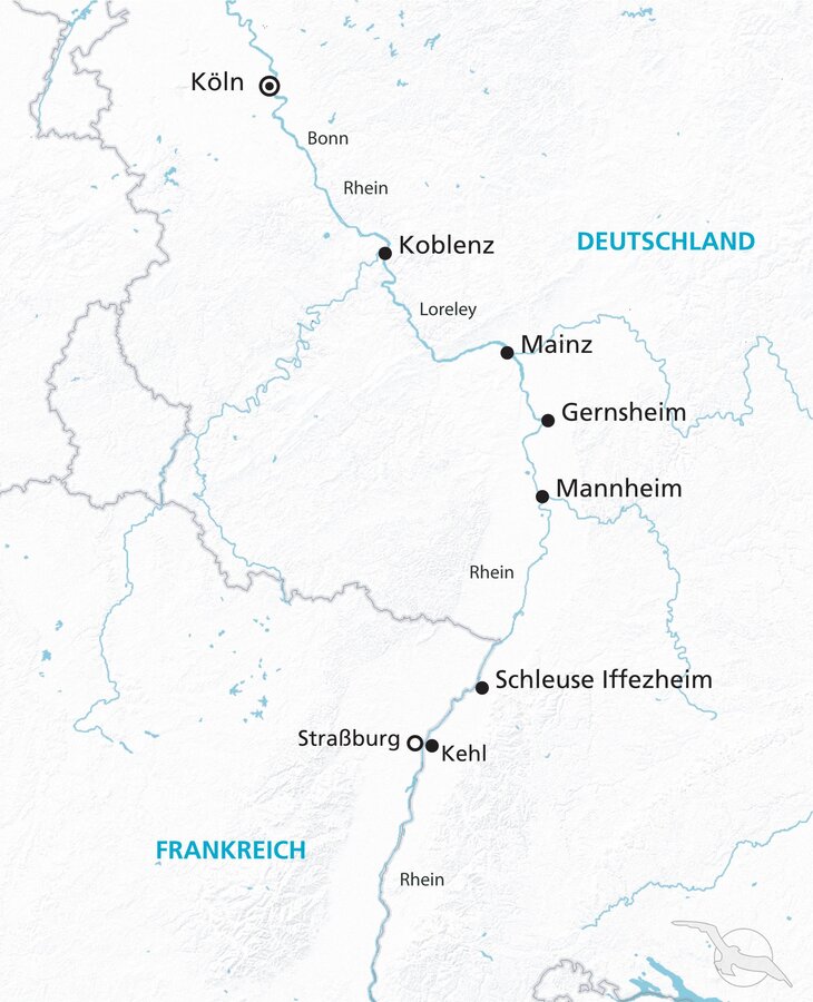 Ombordstigning og afgang om eftermiddagen. Skibet sydpå langs Rhinen forbi Boppard ind i UNESCOs verdensarvsliste Oberen Mittelrheintal til St. Goar. Ruinerne af Rheinfels-slottet ligger oven over den lille by. På den anden side af Rhinen ligger de to slotte Katz og Maus (Kat og Mus), og lidt længere opstrøms den berømte Loreley-klippe. Første overnatning om bord i St. Goar.