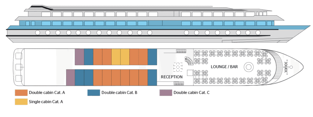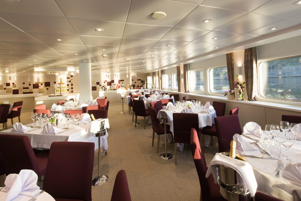 Alle måltider under krydstogtet serveres i restauranten på hoveddækket. Underholdning ombord, musik og dans sker i loungen og baren på Mid Deck-buen, hvor en hyggelig gårdhave også giver en fantastisk udsigt over landskabet.