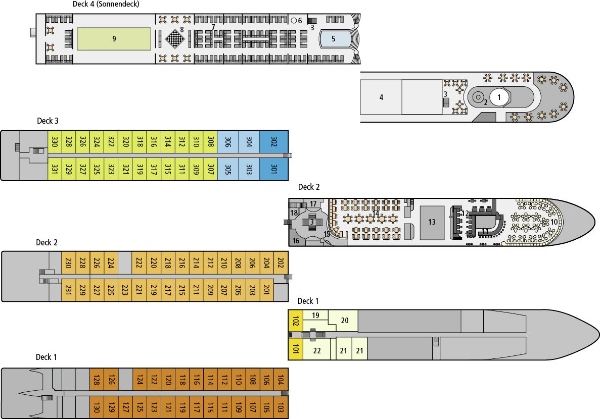 A-ROSA Silva sejler for Arosa Cruises og tilbyder 95 udvendige kahytter. På dæk 3 findes der 24 C kahytter som inviterer med 15 m² størrelse og Juliette Balkon til at nyde den smukke udsigt. På dæk 2 findes der 30 C kahytter med Juliette Balkon. På dæk 1 findes der 27 af de udvendige A kahytter. De har vinduer, der ikke kan åbnes. Alle kahytter er flot udstyret med pengeskab, aircondition, tv, hårtørrer, badeværelse med bruser og toilet, saunahåndklæde, uldtæppe, telefon, badekåbe.