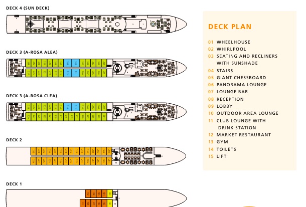 Vi sejler på dette flodkrydstogt med A-Rosa Alea og Aqua som har 4 dæk, hvor dæk 1 og 2 er forbeholdt kahytter. På dæk 3 ligger der enkelte kahytter i forreste del. Der er ikke elevator ombord. Midt i skibet ligger indgangsområdet med receptionen og lobby. Bag dette finder I skibets restaurant og morgenmadsområde med buffet. I bagenden af skibet ligger et hyggeligt udendørs område, der er velegnet til at nyde en eftermiddagsdrink. Allerforrest i skibet ligger spaområdet med massage, sauna etc. I samme område findes et fitnesscenter.