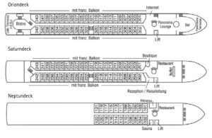 Skibet har elevator (mellem Neptun og Orion Deck). Atrium lobby over 2 dæk med reception, boutique og udflugtskontor. Læsehjørne med reol, sauna, dampbad, lille fitnessområde, vaskeriservice, stor solterrasse med lille pool. Shuffleboard, 4-hullers minigolf, liggestole, siddepladser og skyggefulde områder samt barservice. Observationsterrasse ved stævnen, WLAN (mod betaling), afhængig af sejlområde kan der forekomme fejl/forstyrrelser.
