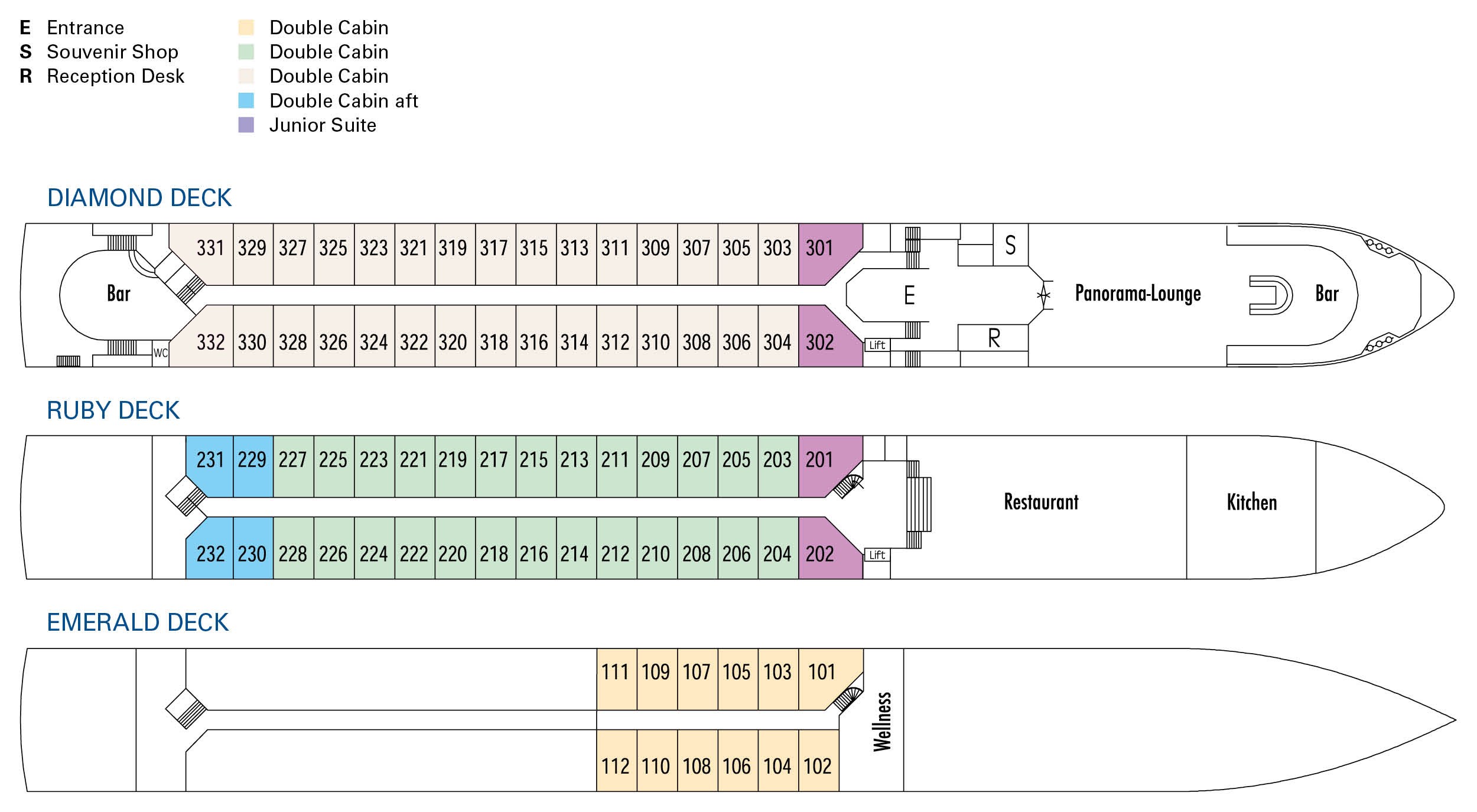 På MS VIVA TIARA som er nyrenoveret i 2020, findes 76 eksklusivt indrettede hytter til 152 gæster. Størstedelen af kahytterne på Diamond, Ruby og Emerald dækkene er 15 m² 2-sengs kahytter. Herfra du kan nyde det forbipasserende landskab via de fransk altaner på Diamond og Rubin dækkene. På Diamond dækket er der yderligere to juniorsuiter på 19 m², som også har en fransk altan. Ruby Deck har to lidt mindre, 17 m² juniorsuiter, også med fransk altan. Kahytterne på Emerald Deck har vinduer, der ikke kan åbnes. Alle kahytter er perfekt udstyret med fladskærms-tv, inkluderet minibar, Nespresso®-maskine, skønhedsprodukter fra RITUALS®, hårtørrer, pengeskab, aircondition, bad og toilet. En elevator forbinder lobbyen med Diamond Deck, Ruby Deck og restauranten. På MS VIVA TIARA kan gæsterne udover hovedrestauranten Riverside nyde en bistro inkluderet i VIVA All-Inclusive samt et wellnessområde med blandt andet sauna og dampbad samt solterrasse med spabad og mange liggestole og andre siddepladser.